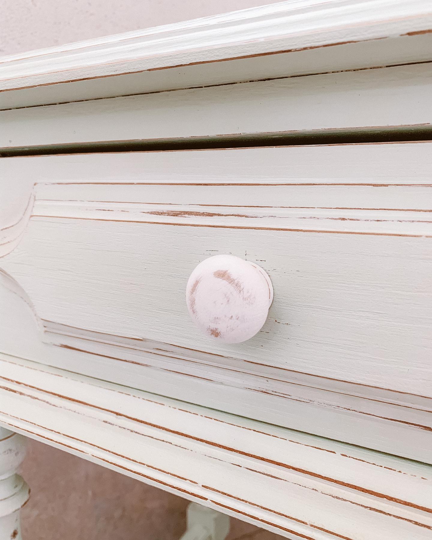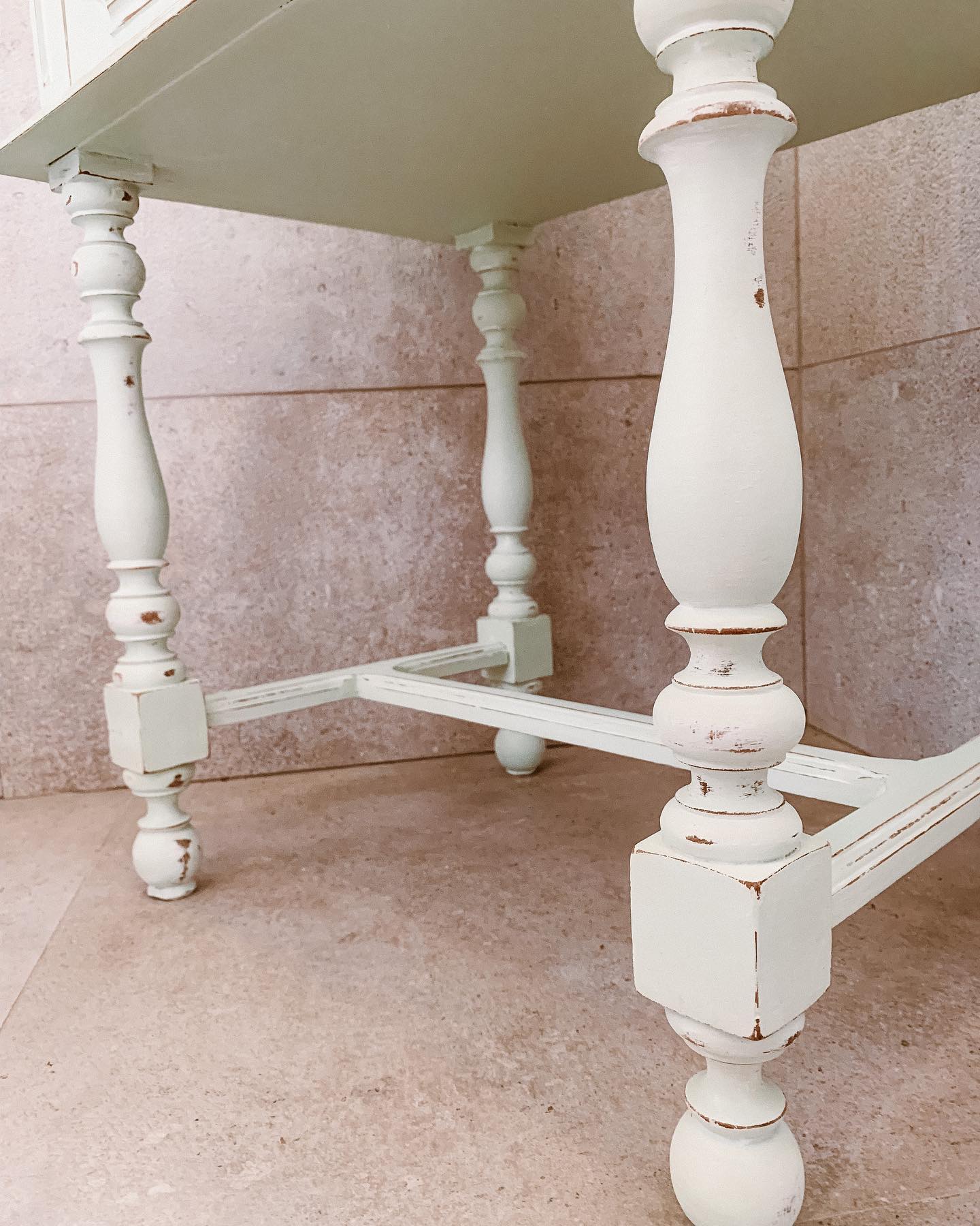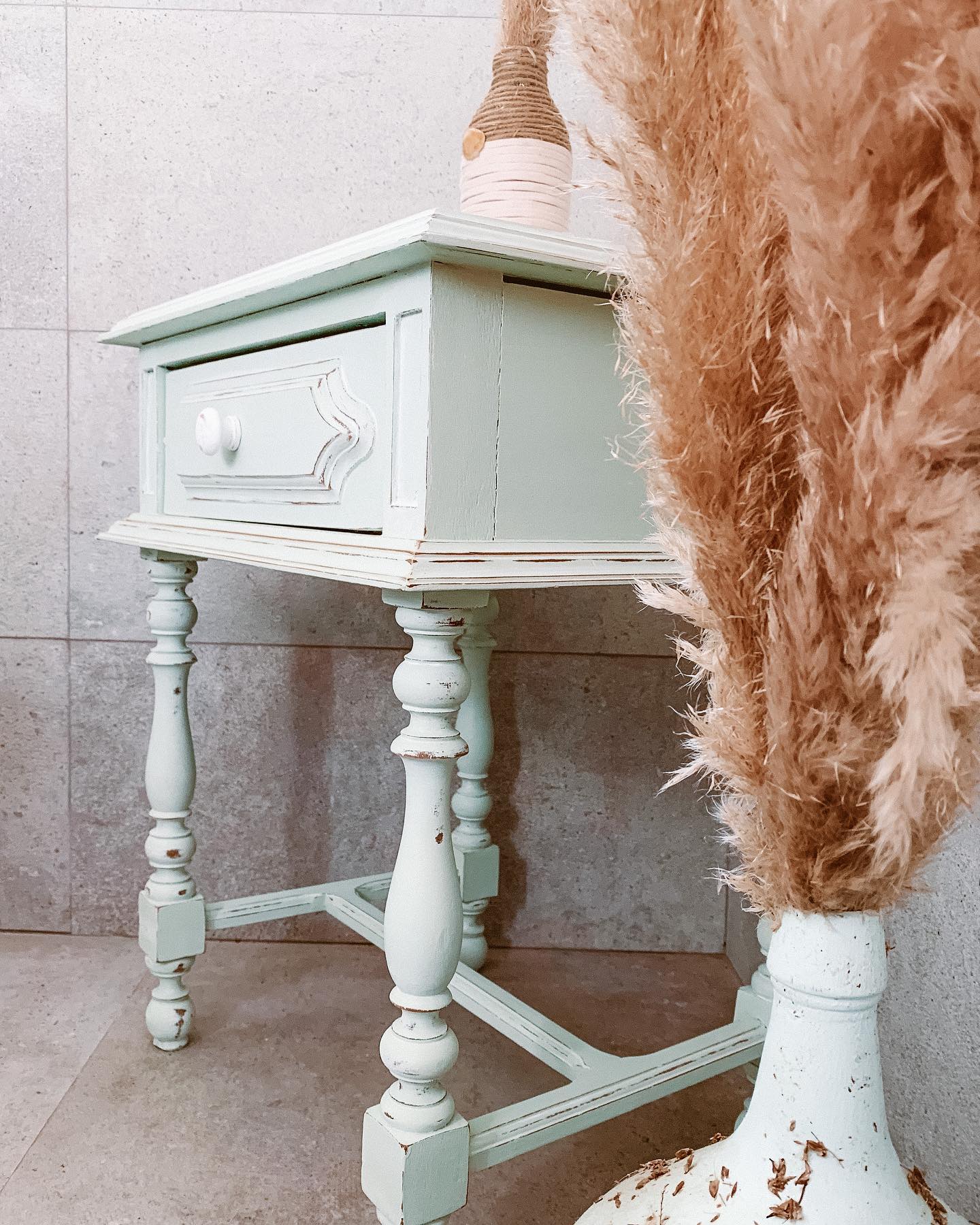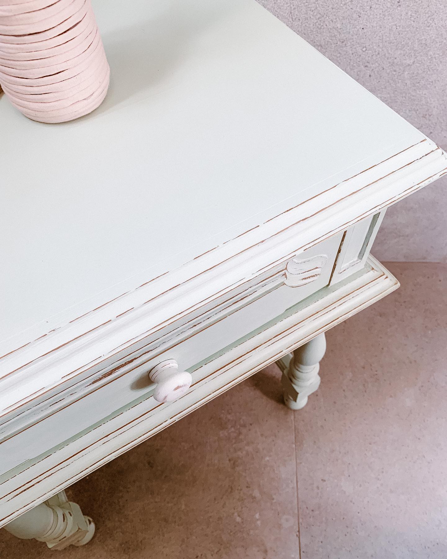 Móvel retirado do lixo em Sesimbra, recuperado em verde pistacho com efeito envelhecido soft e finalizado com ceras incolor e branca. Stencil nas laterais das gavetas + interior.